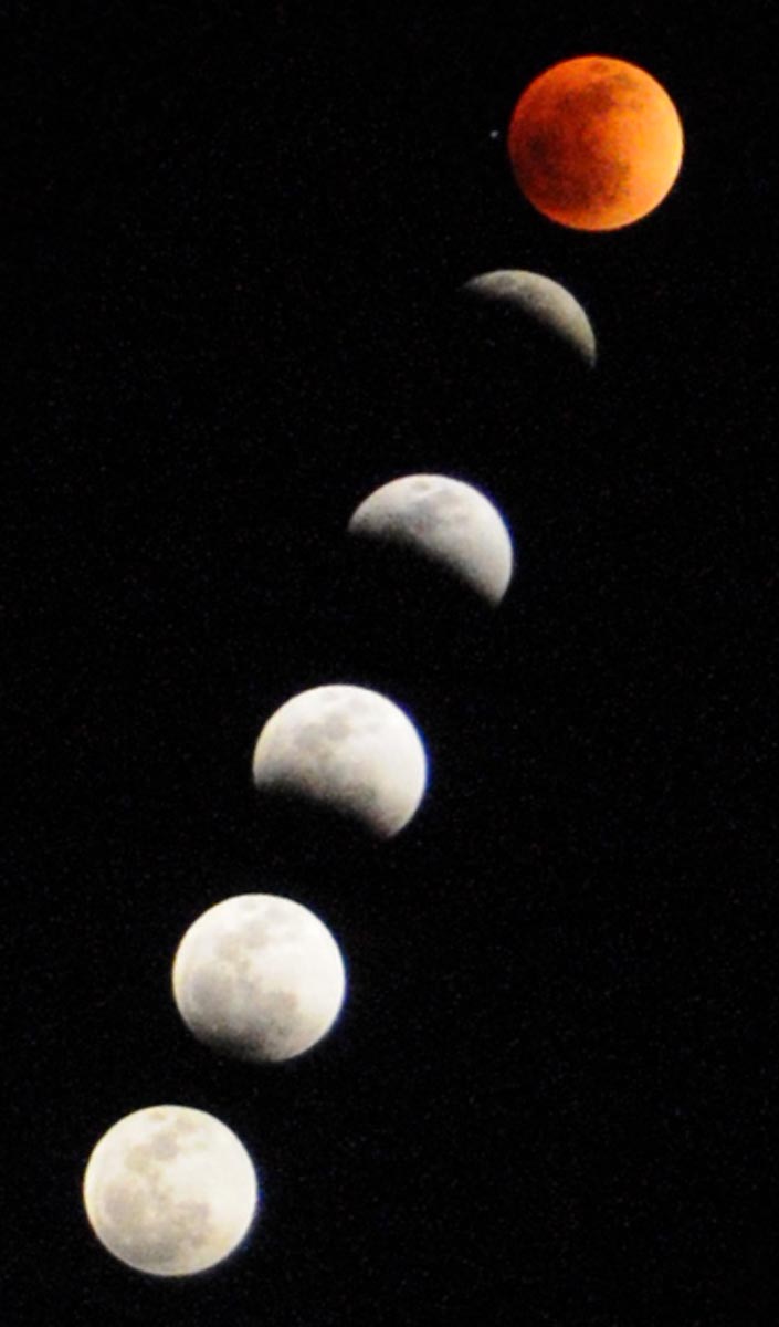The night of 15-16 May provided the first of two total lunar eclipses of 2022. Weather conditions for this "Flower Moon" eclipse were perfect for observing, with clear skies and warm temperatures (and no mosquitoes!). Conditions were good for photography too— the composite sequence to totality shown to the right was shot using a Nikon D300 DSLR with a Nikon 18-200 mm f/5.6 zoom lens. Totality lasted almost an hour and a half, with the moon seeming to disappear from view (for the photo, the exposure was greatly increased to show the coppery totally eclipsed moon). Binoculars revealed the dark russet face of the moon, with a tiny star (HD138413) perched just above its northern limb. The surrounding sky during totality was very dark and star-filled, with faint flashes of lightning dancing along the eastern horizon from distant thunderstorms in the Dallas area. Totality ended around 11:45 PM, with a bright sliver of moon peeking out along the edge of the darkened orb. By 1:00 AM it was all over. The next total lunar eclipse for North America will be on 8 November 2022. For the Cat-Star Sky Ranch area, it will start around 2:00 AM and last until dawn. [posted 18 May 2022]