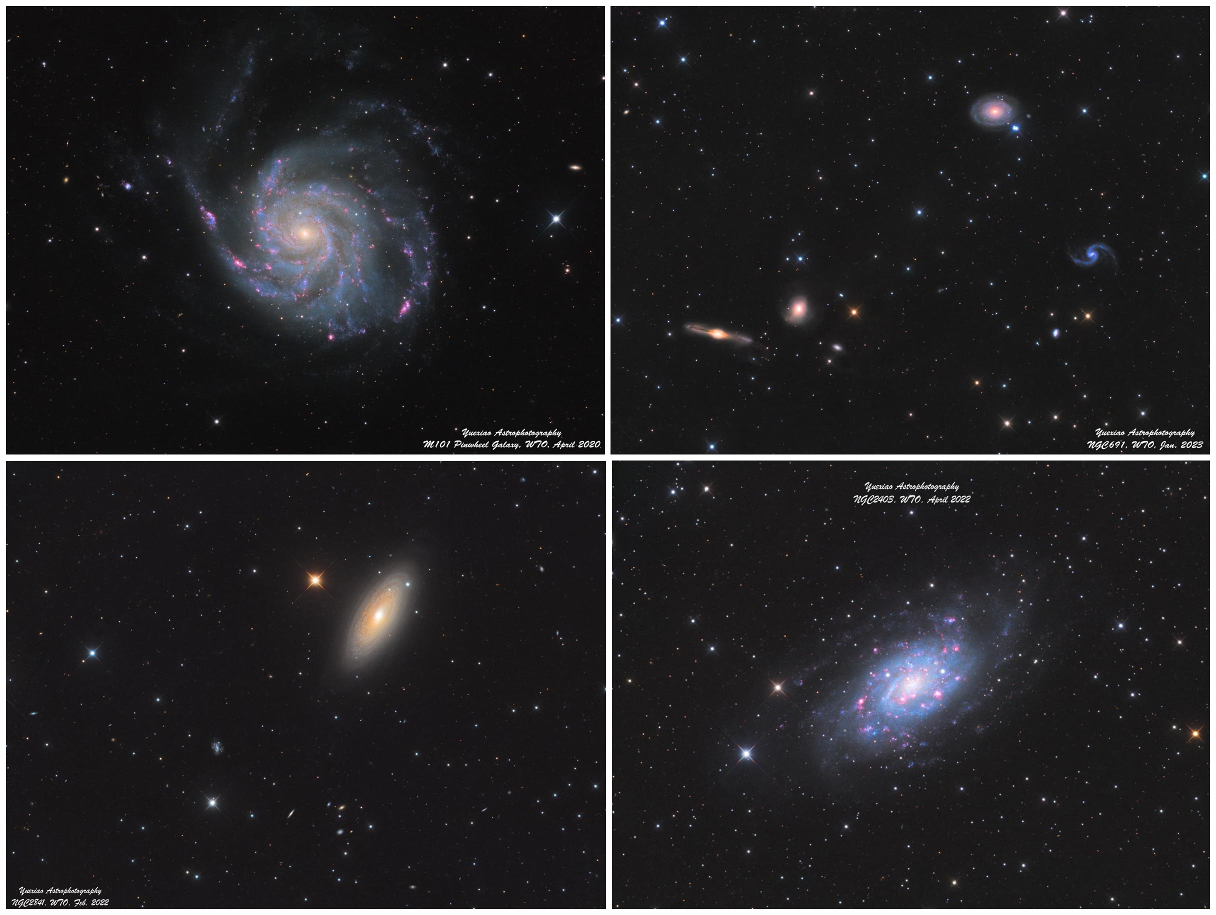 Creating great images of galaxies relies on three things: dark skies, good equipment and meticulous processing. The imagery produced by Yuexiao Shen from his roll-off observatory at Cat-Star Sky Ranch is characterized by all three. Some outstanding examples are shown below. Yuexiao doesn't scrimp on exposure times (20-25 hours total exposure to make each image), allowing his images to display exceptional depth and color saturation. More images and information on Yuexiao's equipment and techniques can be found on his Cloudy Nights webpage. [posted 19 Feb 2023]