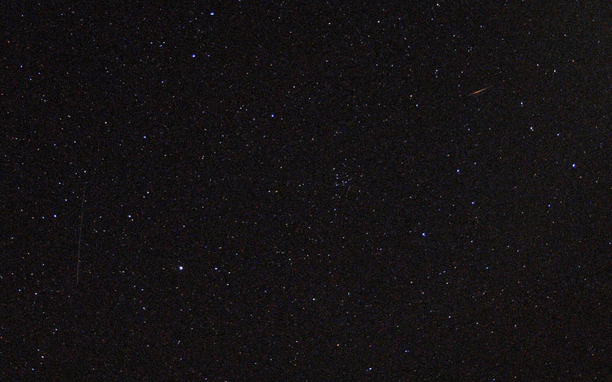 On the night of May 30/31, there was considerable excitement about a possible outburst of meteors as Earth passed through debris ejected by the periodic comet 73P/Schwassmann-Wachmann during its pass around the sun in 1995. Modeling predictions suggested the possibility of a "meteor storm" with thousands of meteors visible per hour around the time of peak activity. Alternately, there might be nothing. With this in mind, optimistic observers gathered to view the event. At Cat-Star Sky Ranch, a camera (Nikon D300 DSLR with Nikon 10.5mm f/2.8 fisheye lens) was set up to record a continuous sequence of full-sky images bracketing the expected peak period, which was predicted to occur at around midnight local time. This resulted in a sequence of 328 30-second exposures starting at 10:07 PM CDT and ending at 1:07 AM CDT. Visual observations during this period yielded 21 meteors— the camera captured ten of the brightest. A portion of one of the images is shown below. Conditions were excellent, with no moon and a clear, very dark sky. The meteors that were observed were very interesting and unlike those you often see. As predicted, the meteors were very slow. They also had relatively short tracks. And, like the one in the photo, they were colorful! The brighter ones were blue, yellow or red, with red predominating. While the "meteor storm" didn't materialize, it still was an excellent viewing event. A summary of shower activity has been provided by the International Meteor Organization. [posted 1 Jun 2022]