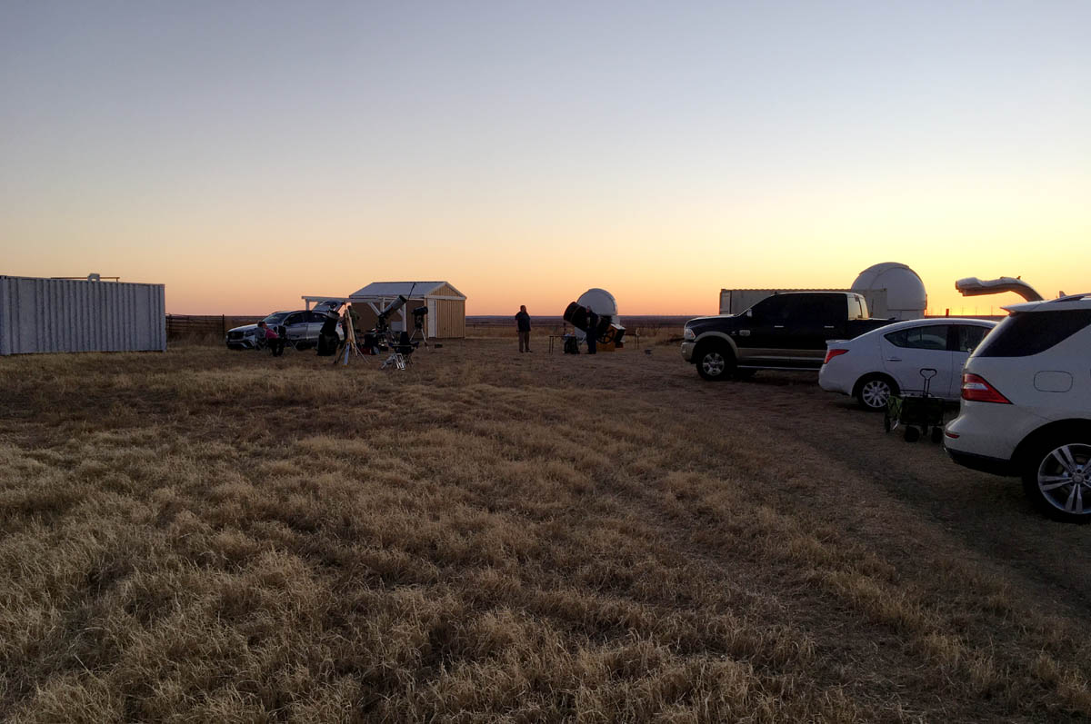 On the night of 2-3 April 2022, Cat-Star Sky Ranch hosted the South Plains Astronomy Club for a Messier Marathon. Around a dozen people attended, with a few literally going "dusk to dawn" to capture as many objects on the Messier list as possible. Skies were clear the entire night. A smiling, 2-day-old moon graced the western sky and set shortly after sundown. Participants who hung around for the duration were treated to Venus, Saturn and Mars rising just before the morning light. Temperatures were mild and winds were light, allowing for a comfortable and enjoyable night. Special thanks to Tom Heisey of SPAC for organizing the event. And congratulations to Robb Chapman for bagging 108 of 110 Messier objects. Some photos from the event are presented below. [posted 3 Apr 2022]